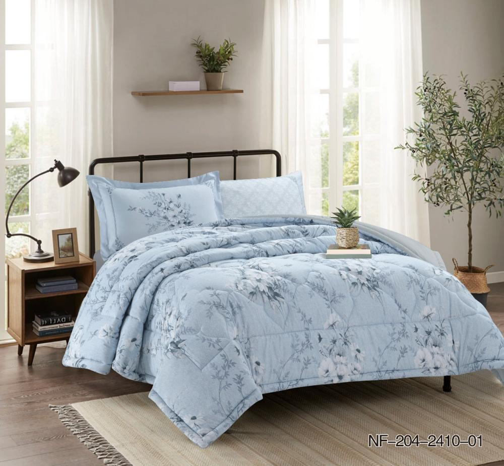 مفرش سرير فخم صيفي مفرد ونصف مكون من 4 قطع بلونه الأزرق الفاتح المنقوش يمنح غرفة النوم مظهراً منعشاً وحيوياً. تصميمه خفيف الوزن وخامته المريحة يجعلان منه الخيار المثالي لفصل الصيف، مع نقشة أنيقة تضيف لمسة من الجاذبية والأناقة إلى السرير.